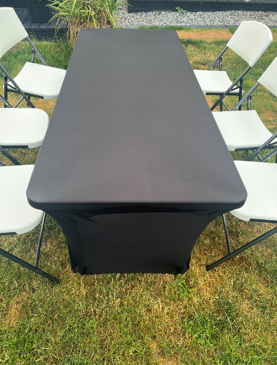 Elevate the elegance of your gatherings with our optional black stretch covers. These covers are available at an additional cost and provide a sophisticated touch to your setup. They're easy to apply and remove, allowing you to customize your table's appearance to fit the theme of your event.